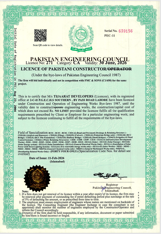 Tijaarat Developers is a PEC Category CA licensed construction firm capable of handling complex projects nationwide. Our portfolio spans residential towers, hospitals, schools, military facilities, and infrastructure developments.